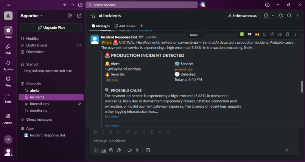 Engineers were drowning in false alerts at 3 AM. I built SentinelAI, an AI bot that detects incidents in 23 seconds, diagnoses root cause, creates Jira tickets, and resolves 67% of alerts autonomously. Zero human intervention required.